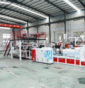 PET片材生產(chǎn)線PET片材生產(chǎn)線是我公司結(jié)合多項生產(chǎn)工藝配方體系,鞏固研發(fā)出的一種免結(jié)晶干燥新型擠出片材生產(chǎn)線。采用精密三輥壓延工藝技術(shù),減少了原料的粘度,提高了冷卻效率,大大提升片材的品質(zhì)和產(chǎn)量。? 生產(chǎn)線由平雙擠出機,液壓換網(wǎng),熔體計量泵,模具,斜三輥,定型平臺,靜電消除,表面涂油,牽引機,分割機,收卷機等。> -